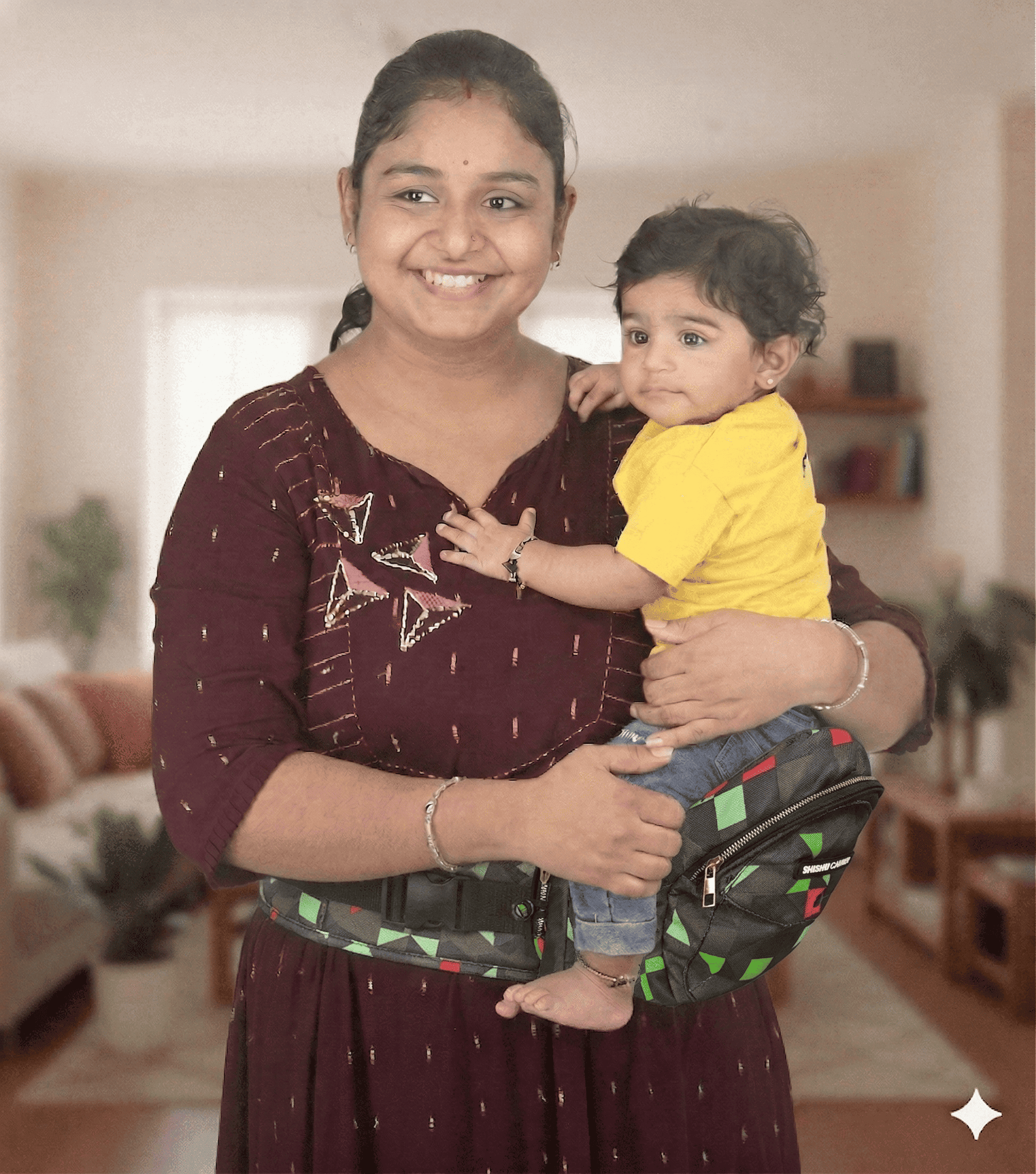 - Shishu Carrier is a baby seat that offers a comfortable way to carry your baby with just one strap that wraps around your waist and sits above your hips.
